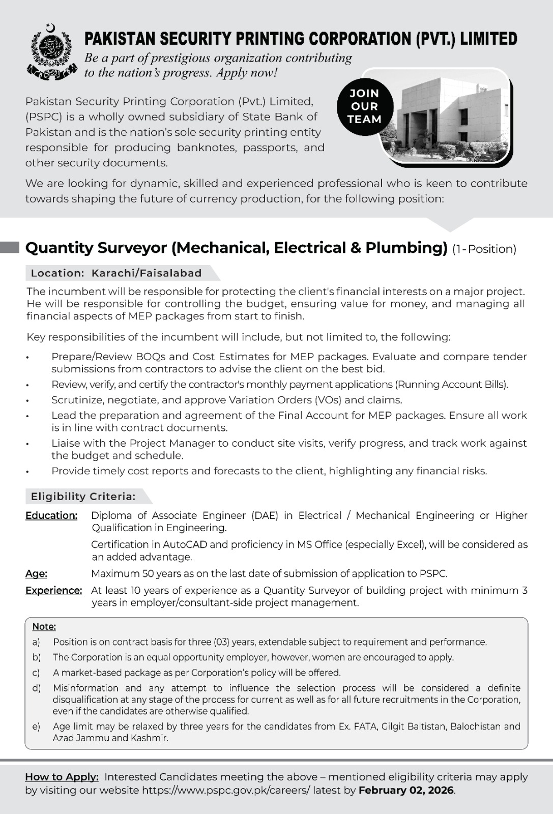 - Position is on contract basis for three (03) years, extendable subject to requirement and performance.