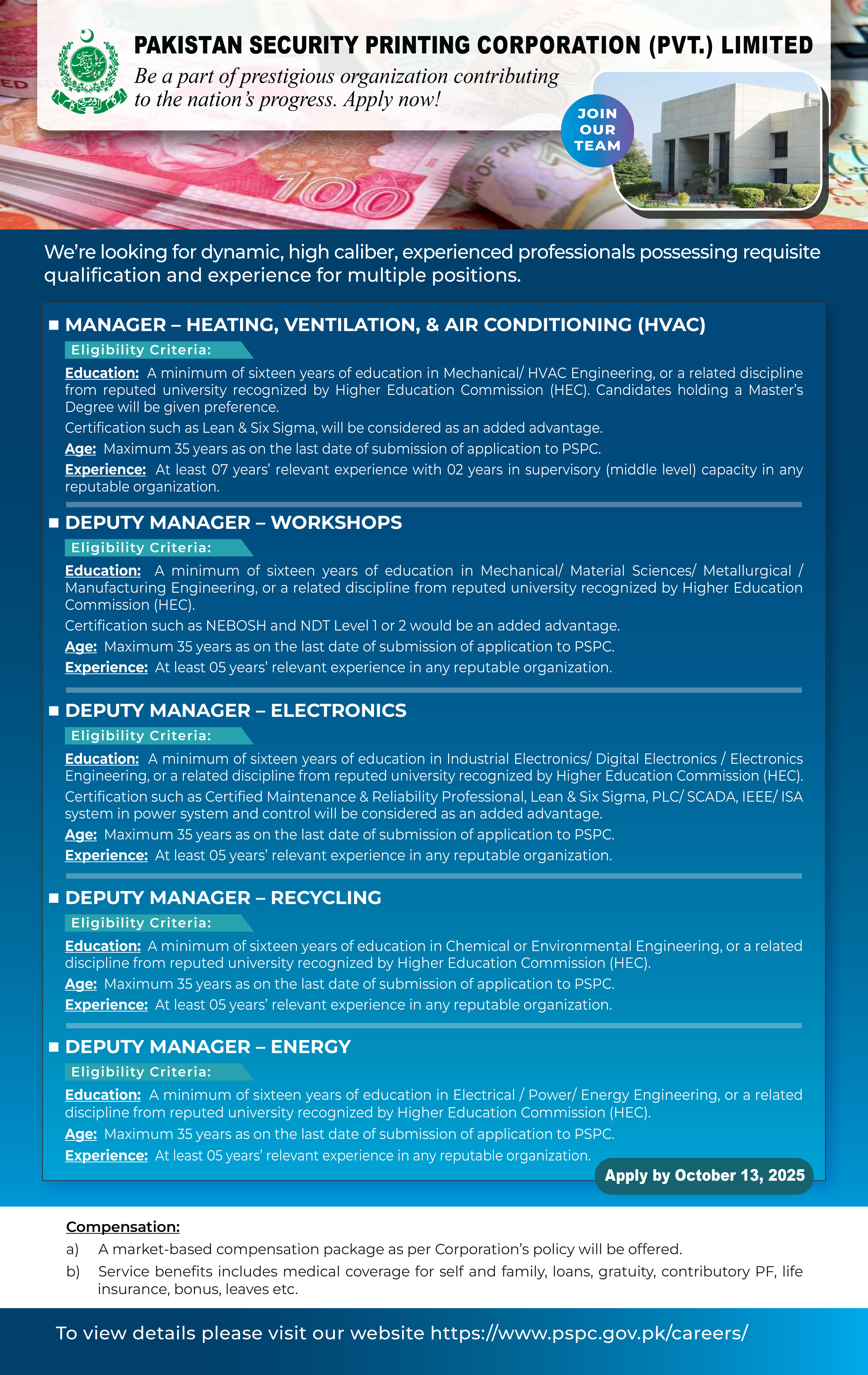 Pakistan Security Printing Corporation (Pvt.) Limited, (PSPC) is a wholly owned subsidiary of State Bank of Pakistan under Companies Act, 2017. The Corporation, being the nation’s sole security printing entity responsible for producing banknotes, passports, and other security documents, is looking for dynamic, high caliber, experienced professional to further strengthen its capacity to achieve its strategic goals and objectives.